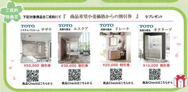 TOTO 浴室「サザナ」洗面台「エスクア」洗面台「ドレーナ」洗面台「オクターブ」ご成約の方